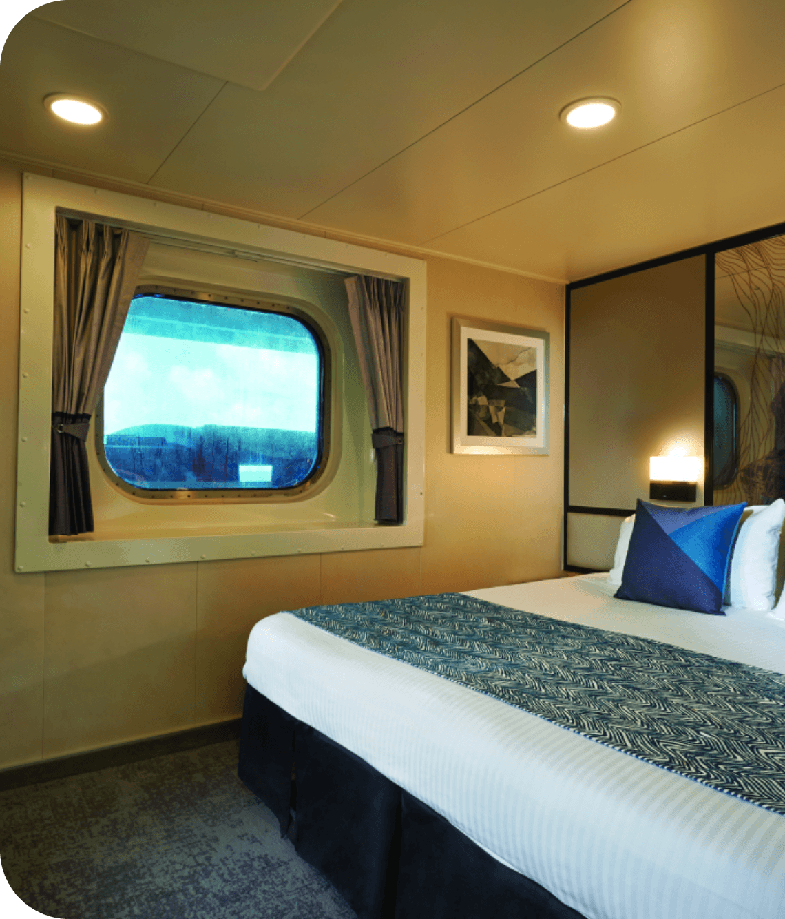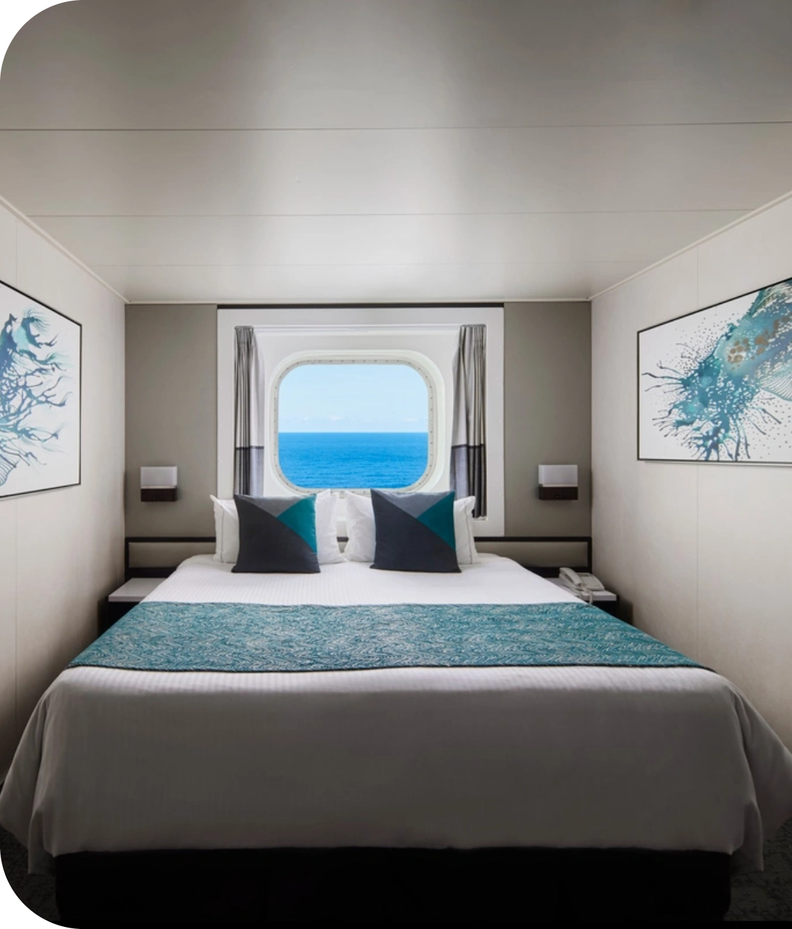 Obstructed OceanviewEnjoy natural light and partial ocean views from this comfortable stateroom — the perfect place to relax between sets and soak in the yacht-rock vibe.